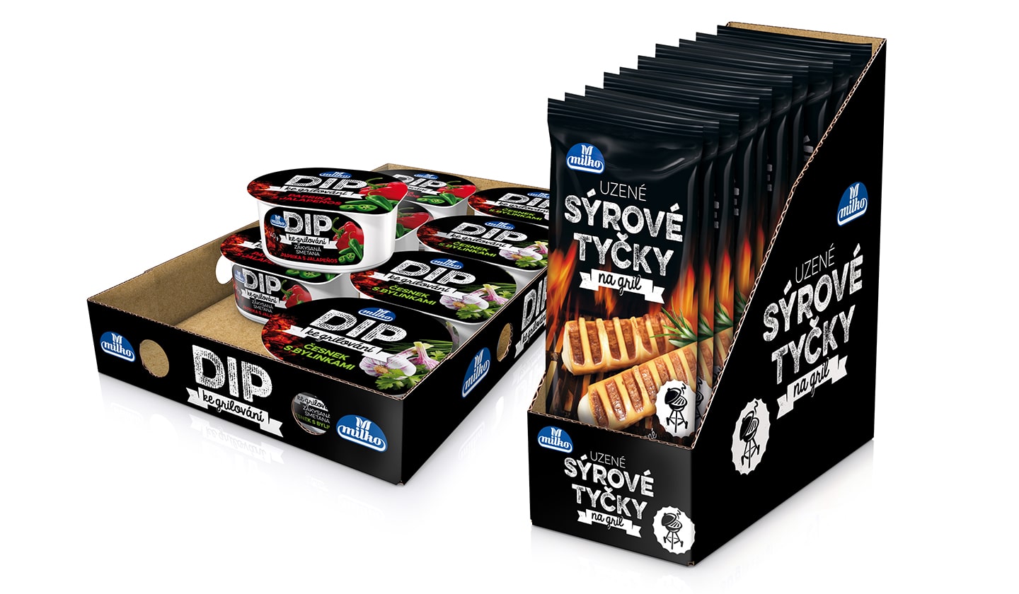 Heat up the grill! Milko is introducing a new grill line. Smoked cheese sticks for grill are expanded by sour cream dips – a delicate herb dip with garlic and a spicy pepper one with jalapenos. Black transport and sale cardboard boxes in a simple typographic design are used for better visibility in the store.