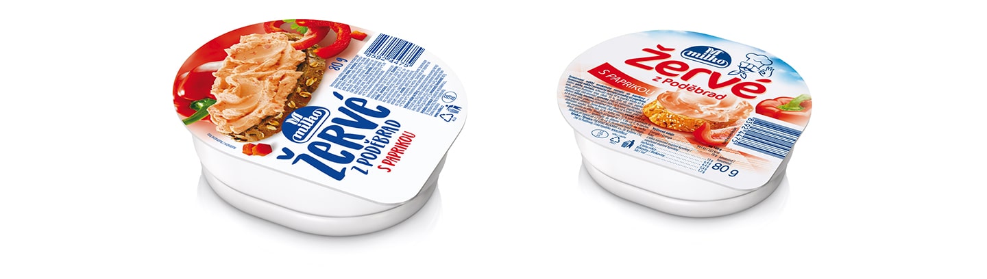 The popular Žervé of Poděbrady (fresh cheese) was significantly redesigned at the beginning of 2023. For better communication, a new product logo was created and the entire design was rotated in portrait mode. This created space for stronger visual communication of the product itself spread on bread, showing flavours and colour coding.